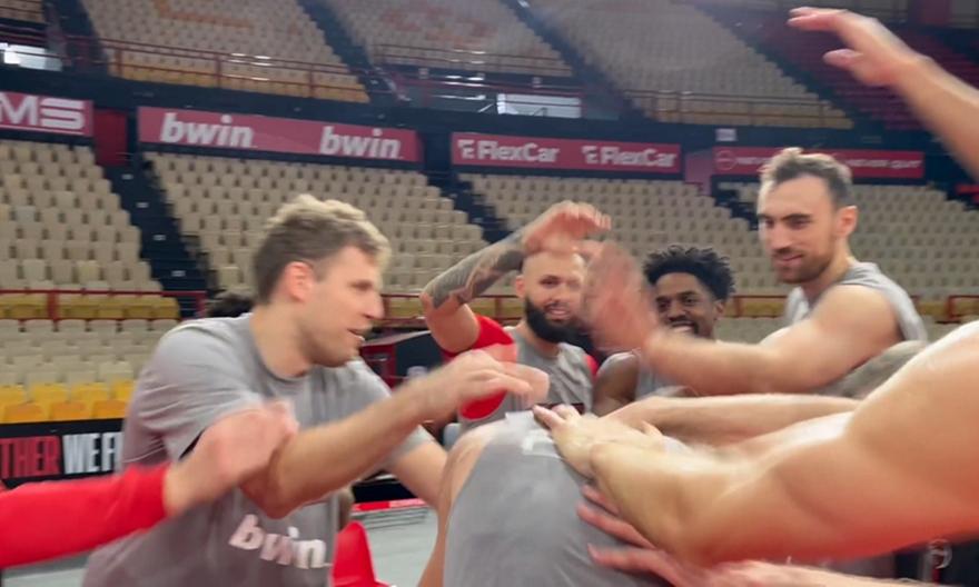 Πριν την προπόνηση του Ολυμπιακού, η κατάλληλη για την περίσταση τούρτα έκανε την εμφάνισή της στην κεντρική σάλα του ΣΕΦ και ο 23χρονος γκαρντ άκουσε τους συμπαίκτες του να του τραγουδούν το Happy Birthday, αλλά και να του δίνουν καρπαζιές και ευχές για αυτή τη γιορτινή μέρα.