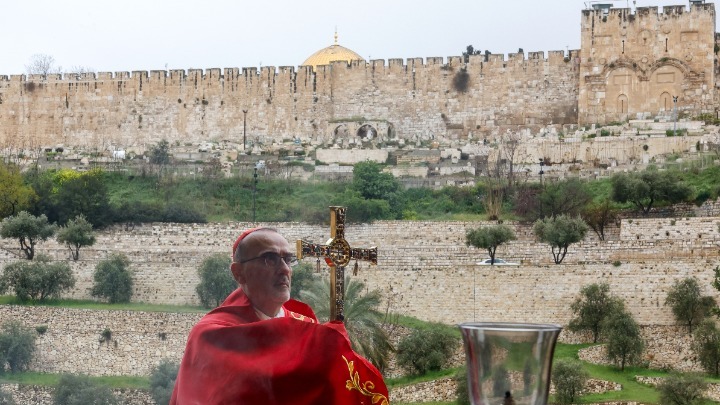 Κατά την προσευχή του, πριν από λίγο στο Όρος των Ελαιών, χωρίς την παρουσία πιστών, ο Λατίνος Πατριάρχης Ιεροσολύμων, ανέφερε χαρακτηριστικά: