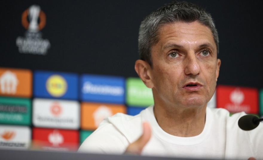 Για το γεγονός ότι είναι το παιχνίδι είναι εξωαγωνιστικά ιδιαίτερο και το αν επηρεάζει την ομάδα: «Έχουμε έναν αγώνα αύριο. Αυτό γνωρίζω μόνο. Πρέπει να προετοιμάσω την ομάδα να είναι 150% έτοιμη να σκοράρει, να τρέξει, να δώσει την μάχη της και να κερδίσει. Τα άλλα θέματα δεν ανήκουν σε εμένα και σε εμάς για να τα σχολιάσουμε».