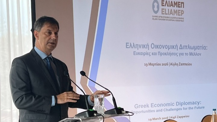 Το Ελληνικό Ίδρυμα Ευρωπαϊκής και Εξωτερικής Πολιτικής (ΕΛΙΑΜΕΠ) διοργάνωσε σήμερα, Πέμπτη 19/3/26, στην Αίγλη Ζαππείου, εκδήλωση με θέμα «Ελληνική Οικονομική Διπλωματία: ευκαιρίες και προκλήσεις για το μέλλον», με αφορμή τη δημοσίευση σχετικού κειμένου πολιτικής.